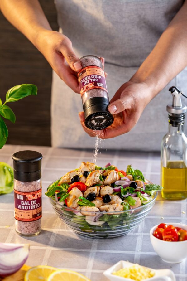 Sal marina artesanal de Manaure mezclada con vino tinto cabernet sauvignon. La recomendamos especialmente para carnes rojas y ensaladas.